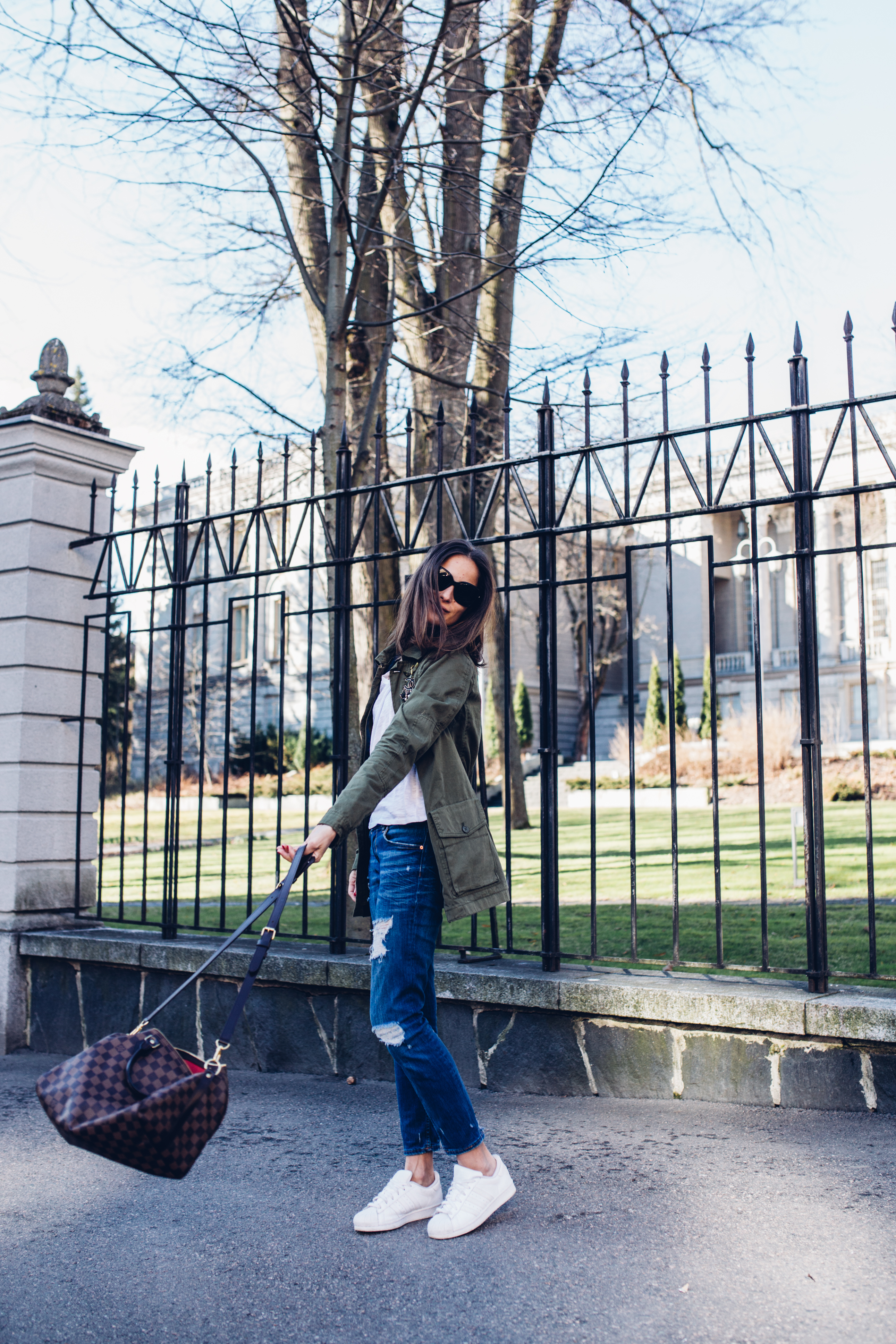 Takki & Farkut // Zara, T-paita // Mango, Sneakers // Adidas, Aurinkolasit // Chanel, Rintakoru // Chanel, Laukku // LV speedy